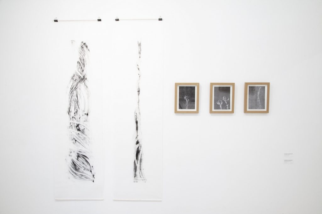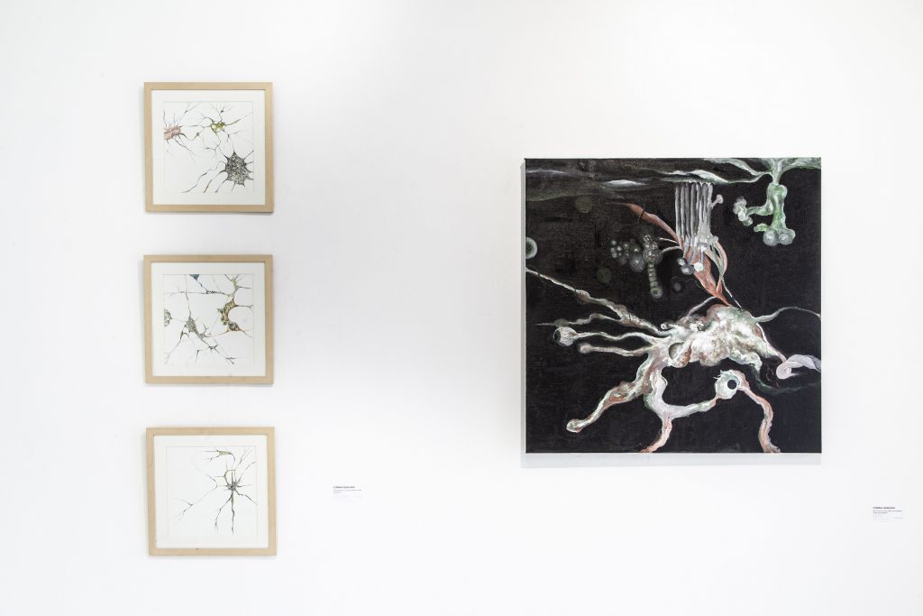 Conexões de Jussara Marangoni: a ideia de um mundo mais abstrato interligado, chegando em fragmentos de imagens orgânicas. Pinturas e gravuras delicadas sugerindo a poesia.