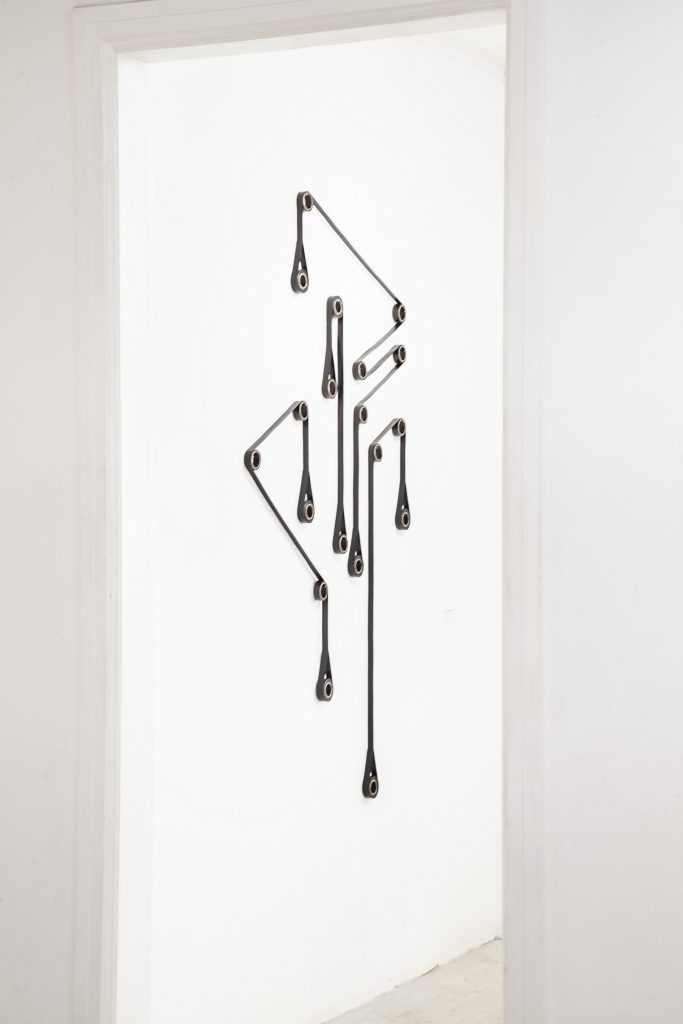 Coadjuvante de Paulo Pinheiro: as linhas do desenho ganham tridimensionalidade e percursos de equilíbrio com materiais usados para o suporte da técnica. Fitas adesivas transformadas em engrenagem de paredes.