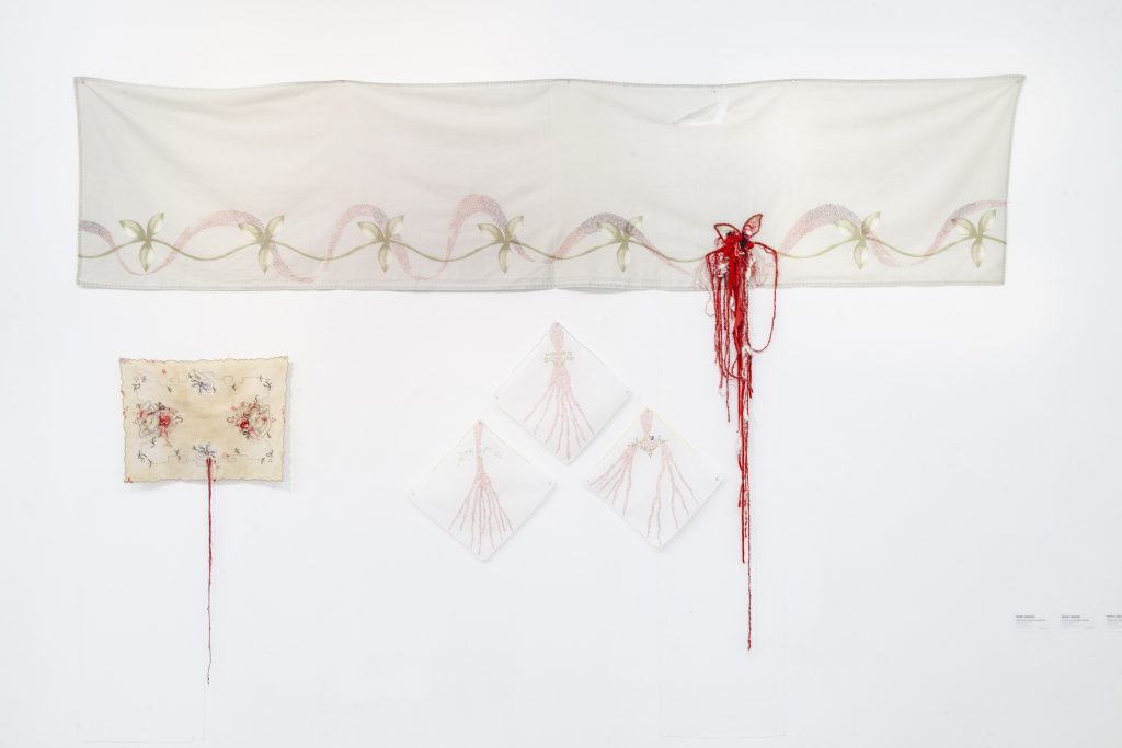 Reminiscências de Rosa Grizzo: as lembranças têxteis e afetivas em tecidos e papéis delicados. Agulhas e linhas costurando e recriando memórias guardadas. Branco e vermelho do universo feminino.